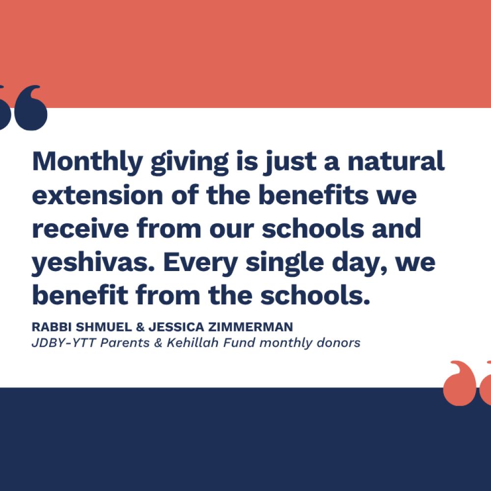 “Monthly giving is just a natural extension of the benefits we receive from our schools and yeshivas. Every single day, we benefit from the schools,” Rabbi Zimmermanexplains. “Monthly giving is a way to always have it in your mind. It’s consistent. It’s the way that institutions are sustainable.”